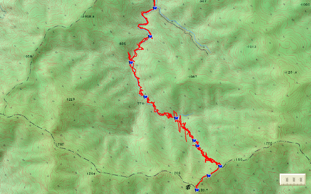 途中、登りで使用した道から少し外れてしまい、谷に出くわす。