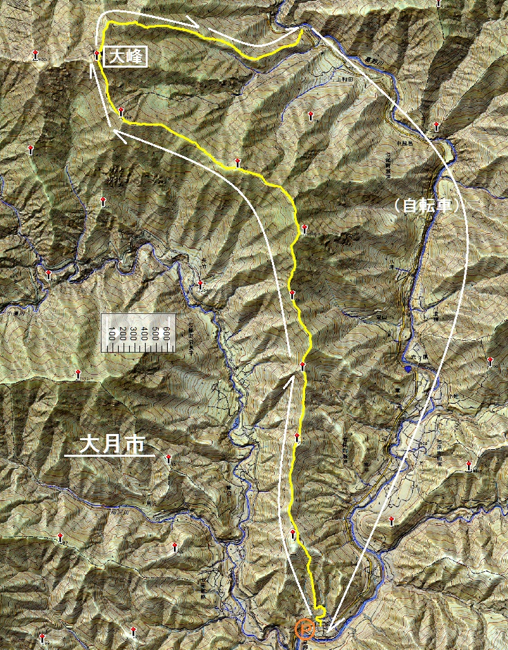 目的の尾根を周回で歩こうとすると、対の尾根と合わせて倍以上の距離を歩かなければならないのが普通なんだけど、尾根に沿って道がある場合は半分を自転車で走れるので、その利を利用してこのルートを計画した。