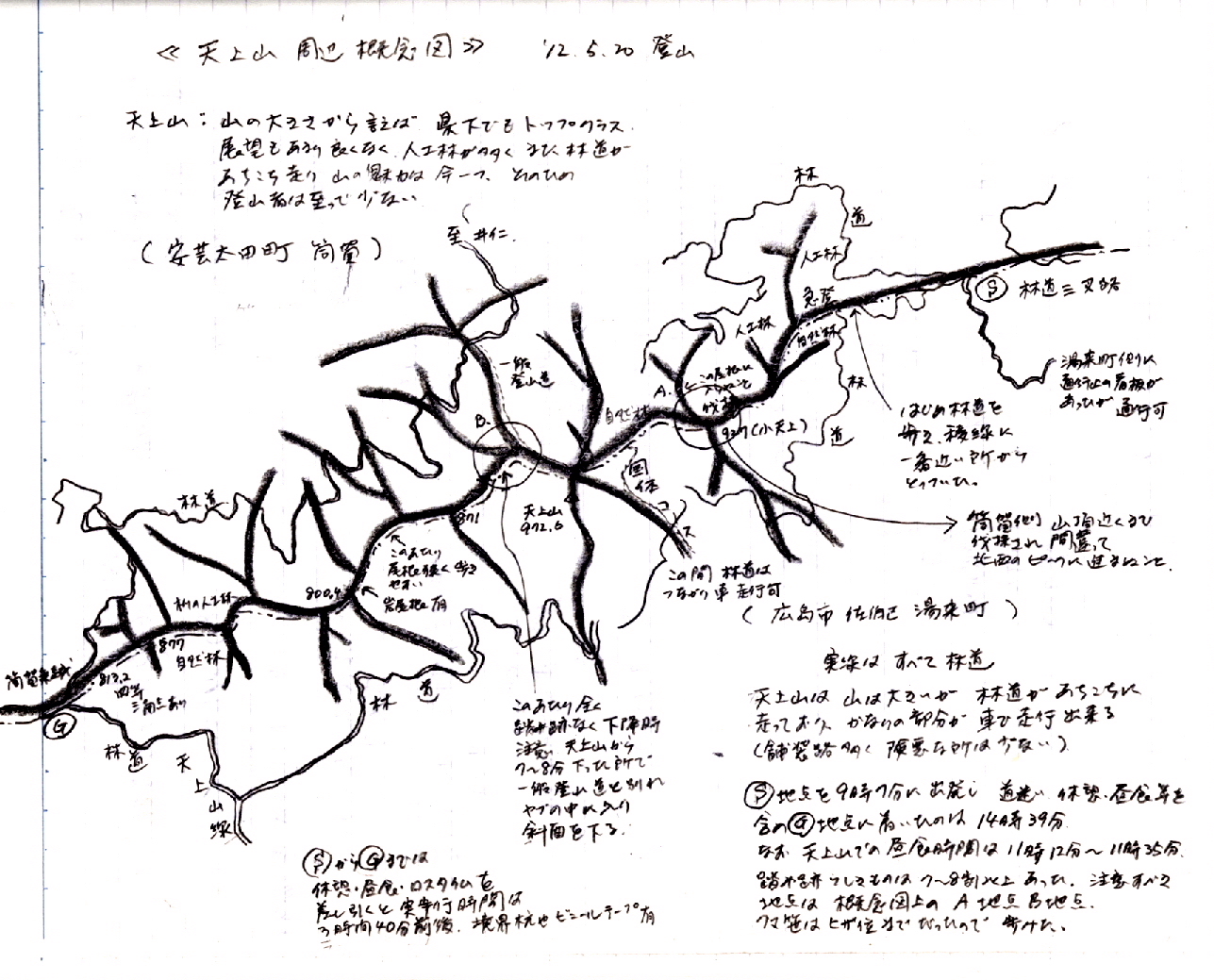 天上山を縦走する 2012年5月20日(日) 天気 曇り時々晴れ 新市境シリーズ第3弾。天上山(972.6)を中心に小天上北東の林道三叉路から林道天上 山線の筒賀乗越までの市境尾根を東から西へ向かって縦走する。 今回は3人の参加、心配していたヤブも思っていたほどでもなく、 全く踏み跡が無いところもあったが全体として8割以上は踏み跡らしきものはあった。 クマザサもせいぜい膝位でブッシュのため前進不能と言った所はなかった。 出発点を9時7分に出発し、取っ付き点を少し行き過ぎて引き返したり、小天上からの 下りでルートを間違えたりしたものの、目的地に着いたのは14時39分。 休憩・昼食・ロスタイムを差し引くと実歩行時間は3時間40分前後。 林道が稜線にもっとも近づいた所から取っ付く(1分足らず)と最初の小ピークである810 mへの急登。桧の人工林(筒賀側)と自然林との境界を背丈の低いクマザサをかき分けな がら登ること16分。今コース中もっともきつい上り。その後アップダウンをいくつか 繰り返すと810mのピークから25分で927mのピークである小天上へ。 筒賀側はピークあたりまで伐採され、谷が明るい。ここから伐採されているところと されていないところを倒木を除けながら鞍部まで下り、杉や桧に囲まれたなだらかな小ピ ークに上る(小天上より10分)が、市境とは別の北西のピークに上っているのではない かと思ってSONYのNAV-Uで確認すると案の定であった。 小天上まで戻り、あらためてルートを探すと山頂からすぐ左手の自然林の中にビニール テープや境界杭それにかすかな踏み跡があった(このあたりが迷いやすいので要注意)。 小天上から10分ほど下ると鞍部(このあたりの筒賀側の自然林きれい)に達し、ここ から5分ばかり上ると湯来町の国原から上ってくる国体コースと合流し、「山頂まで10分」 の標識もあり、道もはっきりしてきたが背丈の低いクマザサで覆われていた。 この合流点から8分ばかり緩やかに上ると筒賀の龍頭峽からの登山道と出くわし、さら に1分足らずで天上山の山頂に達した(山頂は市境から少し外れている)。 山頂は切り開かれたためか平坦であるが、狭く5〜6人が座れる位。展望は北側の十方 山方面が見える程度で大きな山にしてはあまり良くない。 山頂から上ってきた道をわずかばかり引き返し、龍頭峽からの道を下る。山頂から7〜 8分下った所で一般登山道と分かれ左手のブッシュの中を下る。踏み跡が見あたらず、 地図と勘を頼りに下るが、斜面が広いのでコースを間違えやすい。どんどん下っていると 岩の上に出て、下は崖になっていたので左手の斜面をトラバースする。すると尾根のつな がりが見えたのでさらに下る。一般道と別れて15分ばかり下ると最初の鞍部に達し、こ こを3分ばかり上る(途中境界杭に出くわしほっとした)と871mのピークだった。 このピークから先は尾根も狭くなり、踏み跡らしきものも現れ歩きやすくなった。1m 大の岩と境界杭のある小ピークを越し小鞍部に達すると赤さびた大きな看板が倒れかかっ ていたりさらには「湯来町行分分収林」の石柱まであった。その後いくつかの小ピークを 越すとこの山稜にしては珍しく短いけれど岩尾根が現れ、展望も開けてきた。一般道から 別れて最初の鞍部から1時間足らずで900.4mのピークへ。 900.4mのピークから二つ目のピークで左に90度近く曲がっているので直進しないよう 気をつけようと注意しあったものの、踏み跡もかろうじて残っており心配するほどでもな かった。その後もいくつかのアップダウンを繰り返しているうちに900.4のピークから約 40分余りで877mのピーク(一つ手前の1m四方の小さな岩があるピークは間違い)へ。 ここからさらに所々残っている古い踏み跡を10分足らず下ると四等三角点のある813.2 mのピークに。この三角点、ヤブの中に隠れ分かりにくかったので鎌で周りの木を刈って すっきりさせた。その後3分ばかり下ると岩が現れ、ある者は右にある者は左に巻いて 10分足らず下ると目的の天上山林道の筒賀乗越に出た。ただ林道に出る手前はコンクリ ートの高い崖になっているので、これを避けてヤブの中を下ることである。 (参考タイム) スタート地点(小天上の北東方向、林道三叉路)(約3時間40分前後)ゴール地点 (林道天上山線の湯来町と安芸太田町筒賀との境) (コース状況) ほとんど踏み跡らしきものあり(部分的には全くないところもあった)。前進不能の ヤブはなかったが、クマザサが腰以上に伸びる(伸びるかどうかは不明)と結構難しくな るのではないか。ヤブ漕ぎより道に迷わないことが大切。例え地図があっても現在地が 掴めにくいのでGPSは必需品と言える。 |