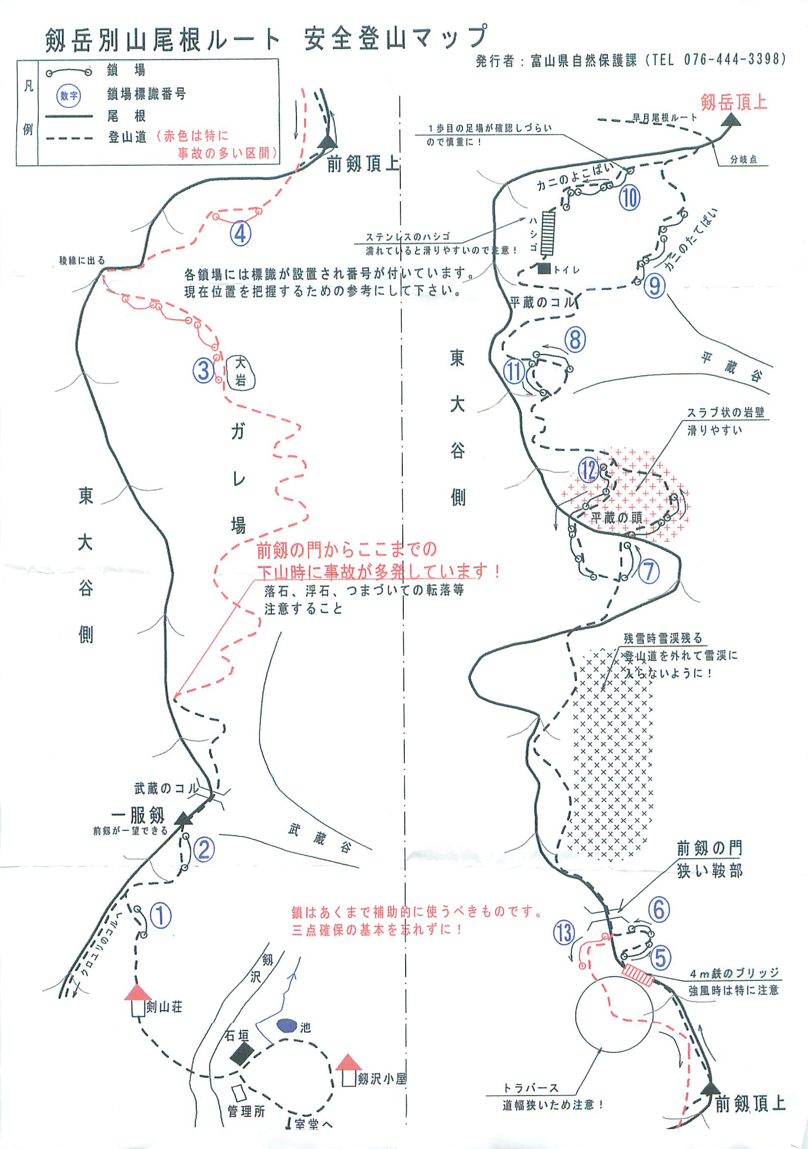 前劔のガレは慎重に。行と帰りが二股に分かれる場所が4箇所あるので注意。 富山県自然保護課作製の安全登山マップが極めて有効。 |