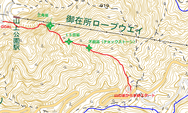 7:50中登山道口-7:55本谷コース口-8:35不動滝(チョックストーン)-9:0015畳岩-9:45大黒滝-10:05三角岩(ジョーズ岩)-10:55山上公園