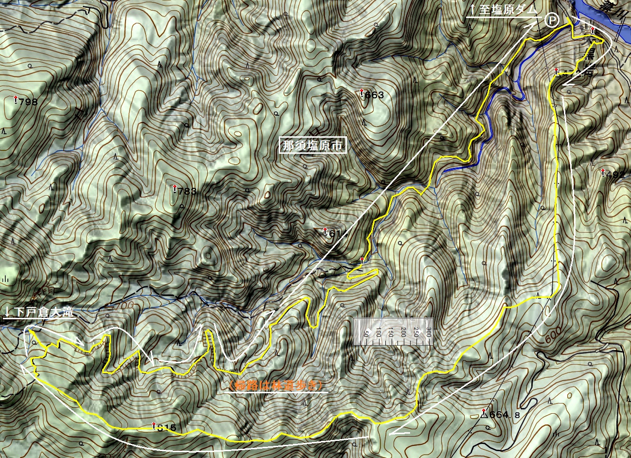 ※ 下戸倉大滝までのルートは登山道ではありません。 ※ 下戸倉大滝からゴールまでは林道ですが荒廃が激しいです。 <スタート〜3つ目の鉄塔> ・危険個所はありません。 ・巡視路のようなので道型があります。 <3つ目の鉄塔〜下戸倉大滝> ・踏み跡はあったりなかったり。(基本的にはあるようです。) ・尾根筋が不明瞭な場所があるのでGPS推奨。 ・若干の灌木ヤブがあります。 ・尾根筋から滝への下降は、等高線の広い場所を選べば問題ないでしょう。 ・滝の上部(右岸)には、九十九折れに登って行く明瞭な道型がありました。 <下戸倉大滝〜ゴール> ・林道終点の位置は地理院地図を信じて良いでしょう。 ・約4kmの林道の第1号橋までは荒廃が進んでいます。 |