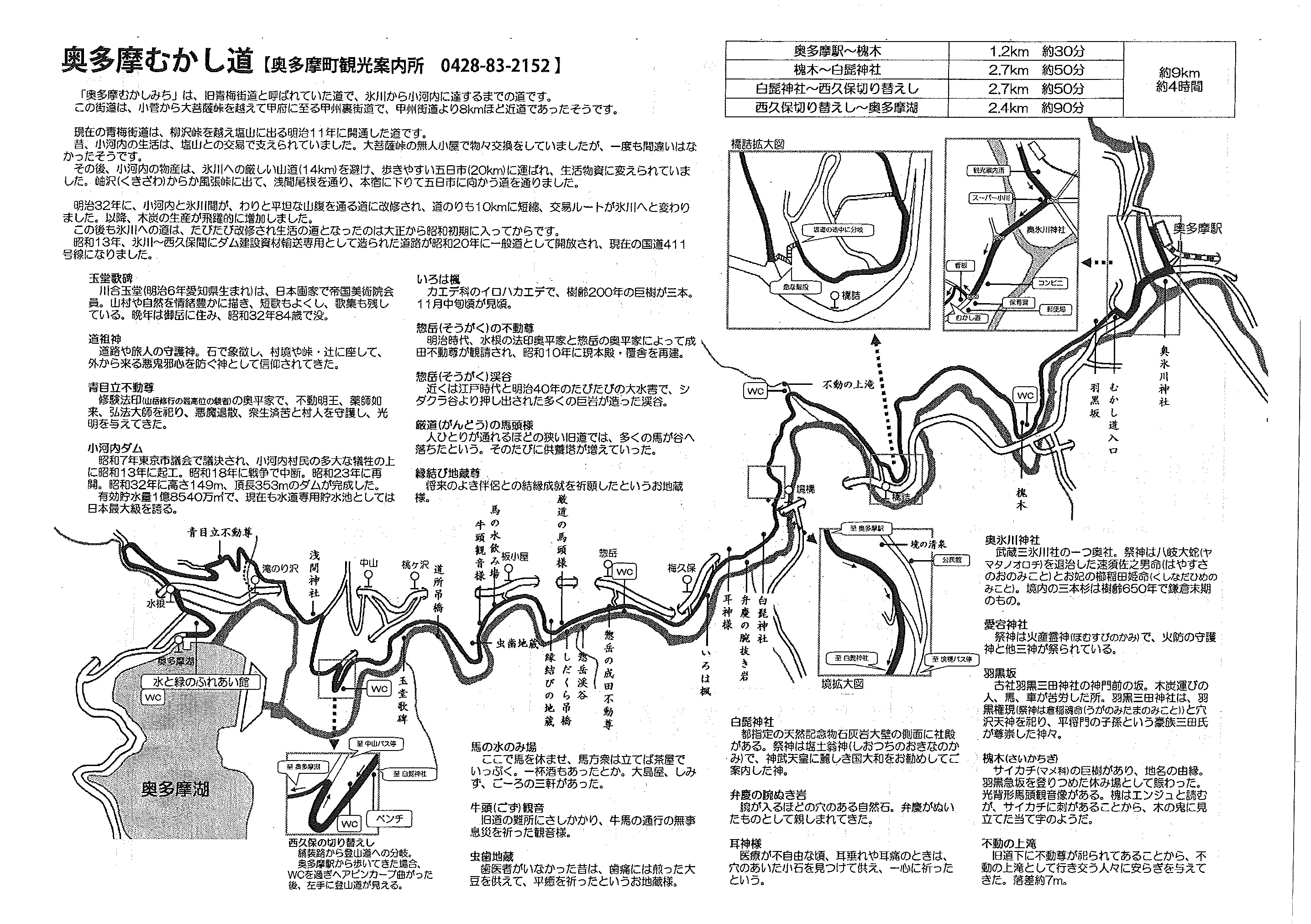 奥多摩湖11:00ー12:00西久保の切り返し(昼食)12:45ー惣岳の成田不動尊(トイレ)13:22ー小中沢(トイレ)13:50ー橋詰バス停14:02ー(青梅街道)ーむかし道入口14:30