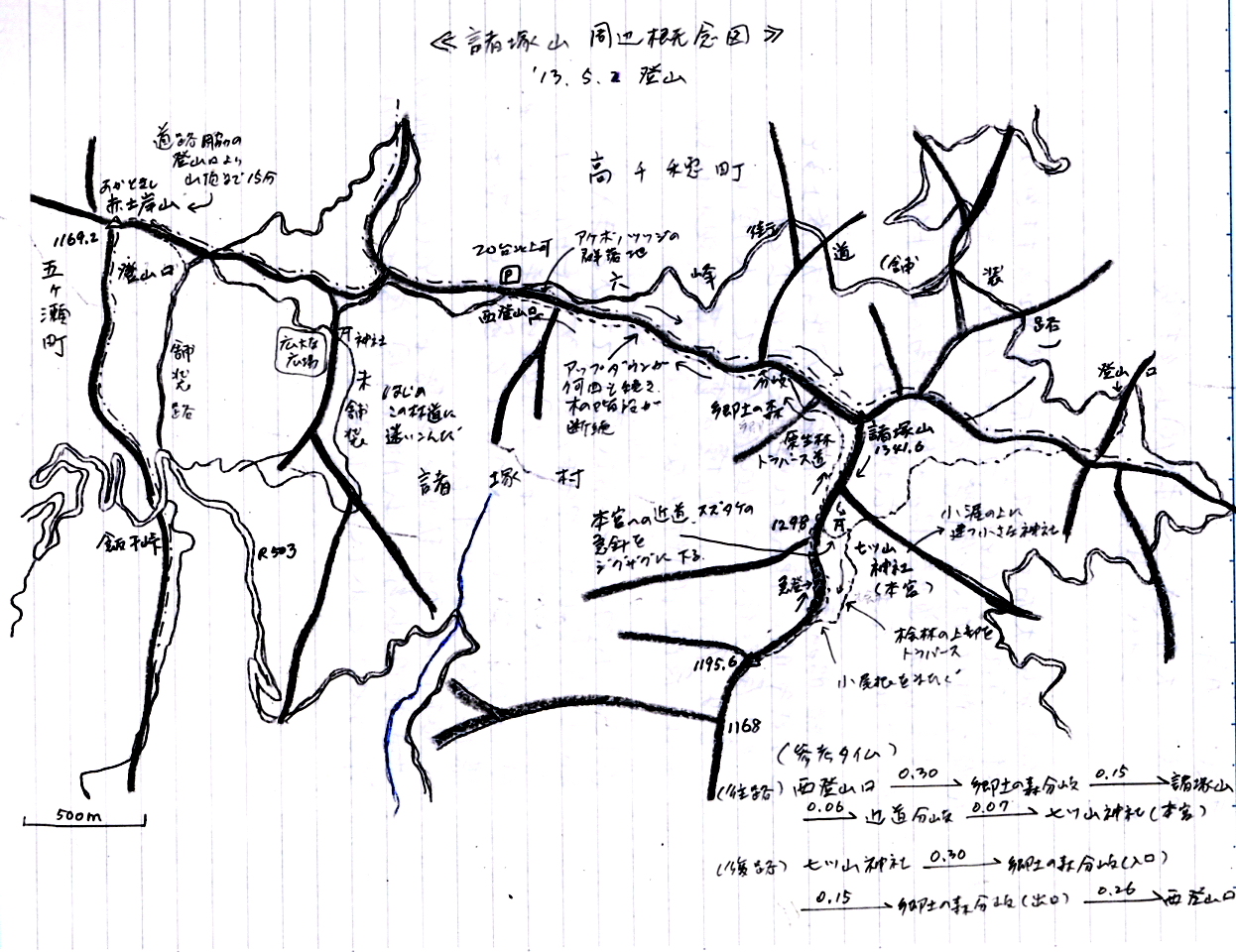 宮崎 諸塚山(1341.6) 2013年5月2日(木) 晴れ コース:西登山口〜諸塚山〜本宮近道〜七ツ山神社(本宮)〜郷土の森〜西登山口 (所要約2時間10分) かねてより登ってみたかった山。しかし舗装された大規模林道が山頂近くまで走ってい たので思ったほど大きな山という感じはしなかった。また山頂近くにある本宮(もとみや) (七ツ山神社)は険しい崖の上にあるよほど大きな神社かと思っていたが、思いの外、小 さくわざわざ出かけて見るほどのものではなかった。諸塚山に登って良かったのは山頂か らの展望(霧島連峰が見えた)と郷土の森と呼ばれる原生林だった。 登山道はほぼ尾根伝いで道幅も広い。しかしアップダウンが何回も続き、木の階段がほ ぼ山頂手前まで断続的に現れ、時には30度近い急な階段もあるが、それもわずかな距離。 標高1200m〜1342m間は天然樹林帯でスズタケの中にブナやミズナラそしてミズメが 入り交じる(案内板あり)。また8合目には樹木の大きな案内板もあるので、ぜひとも目を 通しておこう。登山口から約40分。ブナの大木群を見ながら丸太の階段を上りきると諸塚 山の山頂である。山頂はあまり広くはないがこんもりした丘と言った感じで、ベンチも置 いてあり思わず腰を降ろしたくなる。展望はまずますで東や南方面が開ける。 山頂から南へ5分ほど下れば西登山口への分岐。ここからさらに1分足らず下ると本宮への近道分岐。スズタケの急斜をジグザグに下るが、ロープも現れる。道幅も狭く、所々 足元も不安定になるので慌てないこと。分岐より7分下ると、諸塚大白太子大明神(本宮) に着いた。ところがこの手前でもう一つの道と合流し、下に降りていたが案内標識には 諸塚山とあったのでびっくりした。なんで下に降りる道が諸塚山なのか、間違いではない のかと思ったが、山頂に達するもう一つの道であることが分かり、帰途はこれを使った。 本宮は崖の上に立つ小さな社でここから六峰街道へ抜ける道もあった。帰りに使った道 はしばらく下り気味で道が違うのではないかと不安もあったが、桧林の上部をトラバース 気味に登ると小さな尾根を乗り越し(古い小さな鳥居あり)、再びトラバース気味に登ると 諸塚山の山頂から南西に伸びる尾根に出くわした。すると山頂と南登山口(通行不可)と の標識に出くわし、ここで右に折れて山頂に向かった。途中急登もあるがこの分岐から 17分ばかり登ると郷土の森を経て西登山口へ向かう分岐に達した。これをそのまま直登す ると山頂だが、ここで左に折れて郷土の森に入る。 ブナやミズナラなどに囲まれた感じの良い原生林の中の起伏のない巻き道を15分歩くと 西口登山口への分岐に達し、後は登ってきた道を引き返すだけだった。 ところでこの山に取っ付く前、登山口を間違えて手前にあった未舗装の林道を下降して いたのである。赤土岸山を登り終え、車で諸塚山へと向かっていると峠にさしかかった。 手前には駐車場を思わせる広大な広場があり、その上には立派な神社があった。 おまけに神社の前から未舗装ながらも幅の広い林道が走っているではないか。諸塚山の登 山口はこの林道を少しばかり下った所にあるに違いないと思って下る。 ところが下っても下っても登山口らしきものが見つからない。車を駐めて地図と磁石で 現在地を確認しようとするが、ウォ地図から引っ張り出したものだから縮尺が小さくて道 路の状況がよく分からない。あせればあせるほど今一体自分がどこにいるのかますます分 からなくなる。最後の手段でGPSで確認するとどうも別の道へ迷い込んでいるような気が してUターン。もとの舗装路に戻り、あらためて前進。巨大な広場の上にあった神社より 先にはもうこれ以上(標高の)高いところはないと思っていたのだが、平坦路を前進する と紛れもなく左手に駐車場のある登山口に達し、ほっとした。 どこをどのように走ってきたのかその軌跡を掴むまでにはかなりの時間がかかった。 しかし、結局の所、地図の縮尺が小さく林道の記載がはっきりしていなかったり、おまけ に地形が似通っていたりさらには林道があちこちに走っていたので迷い込んでしまったよ うだ。 それにしても、もしこれが単独でやって来てGPSでもなかったら、山に登る前に 迷い込んでいたのではないかと思うとぞっとする。 |