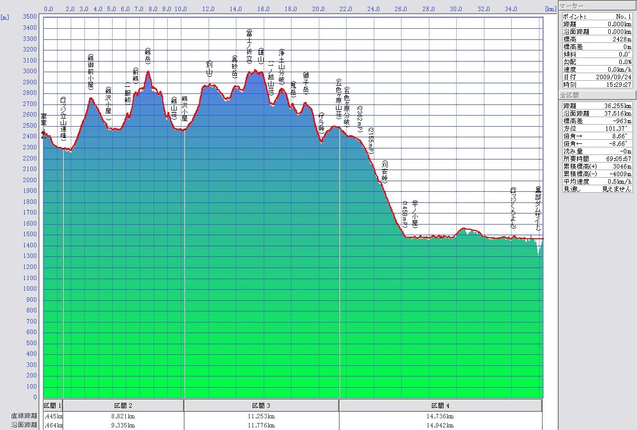 GPS記録 by 「カシミール3D」 縦走路の速度の変化