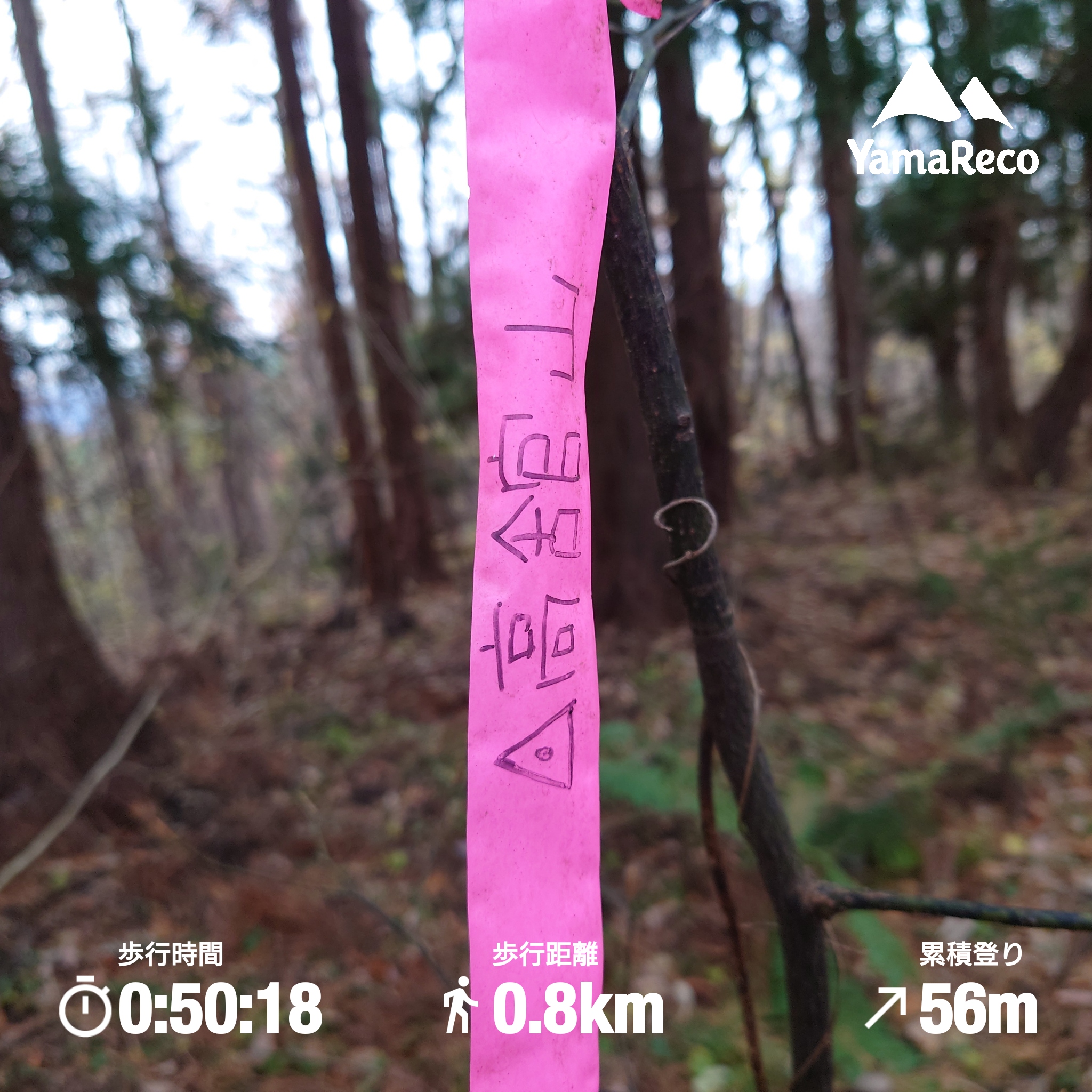 斜面のコンクリートで舗装されガードレールも折れ曲がってしまった所から登りました、そこに車も駐車11月21日葉がなく多少の枝などがあるけど大した薮こぎにもなりませんでした、コンクリートの斜面を少し登るとコンクリートで出来たタンクが二か所あり何十年も前に水をためて利用していた感じです。すでに葉が落ちていたので見通しがきいてこの時期にしか無理かなとも思いました、山頂は台地なっていて国土地理院の三角点がありました。