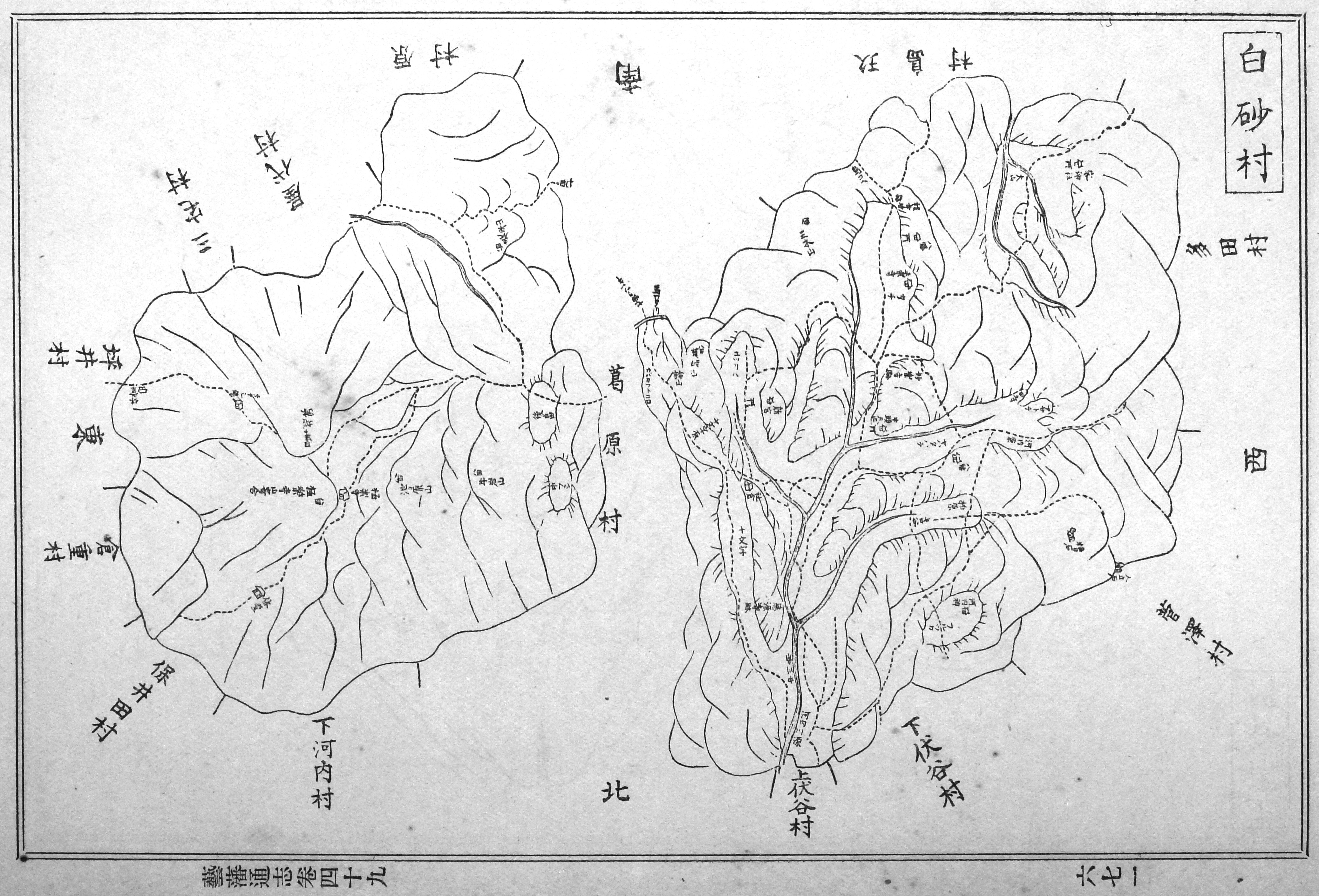 極楽寺山の名前は、真言宗上不見山極楽寺に由来し、行基が天平3年(731年)に開山したと伝えられる。極楽寺は旧白砂村後畑にあって、山麓には13村があり、江戸時代にはこれらの村から極楽寺への道が整備され一つの共同文化社会を作っていたという*。芸藩通志の白砂村**に後畑と極楽寺が記載されており、古くより、極楽寺には、後畑、坪井、倉重から参道があったことがわかる。図中の池の原山が、現在の蛇の池の北側の山(690m)であろうか。牛岩山というのもあり、こちらは牛池(ため池)と関係があるか。