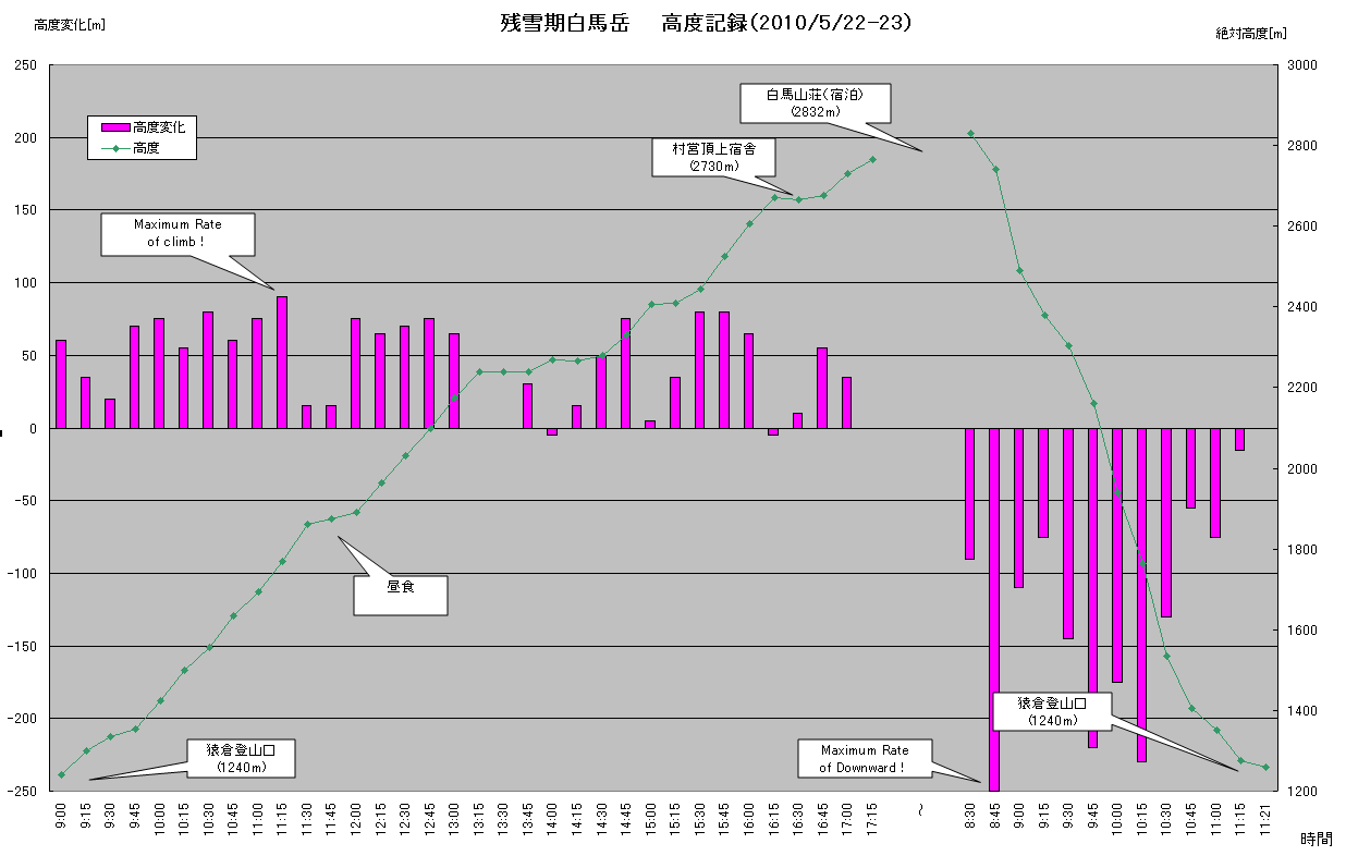 11:30には猿倉に到着。添付ファイルの高度記録を見て頂きたいが、我々メンバとしては驚異的な下山速度。ゆるい雪がクッションになり、足腰が楽であったため出た速度であろう。