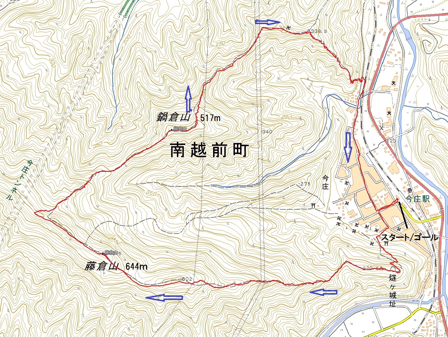 今庄駅10:23〜燧ヶ城跡10:51〜藤倉山12:21/13:01〜鍋倉山13:56〜弘法寺14:43〜今庄駅15:43 |