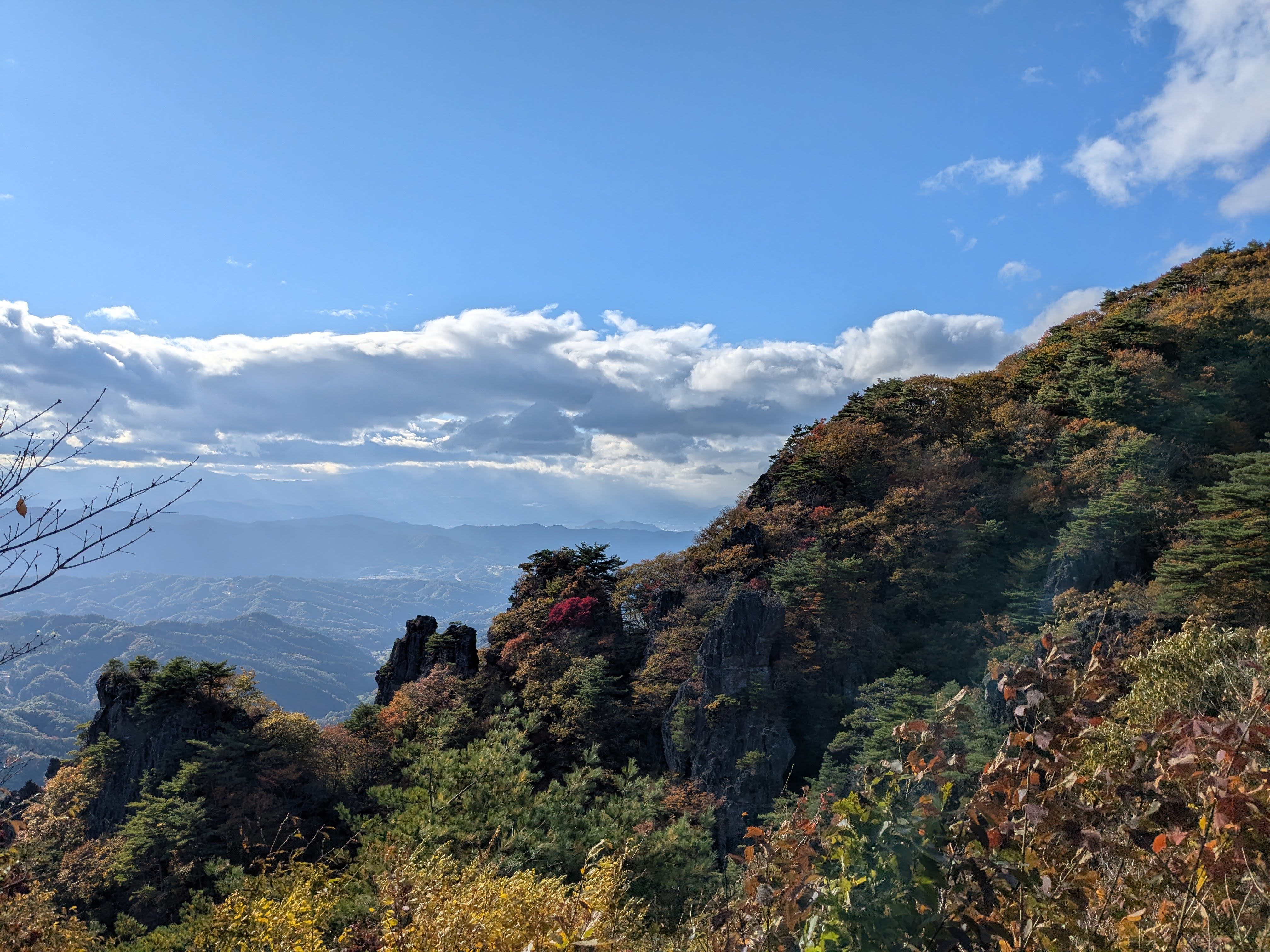 標高は低い方ではありますが、周囲に高い山もないので、抜けがよく遠くまでよく見渡せます。紅葉と岩との景観が美しい山です。