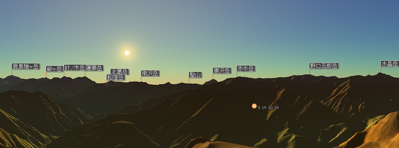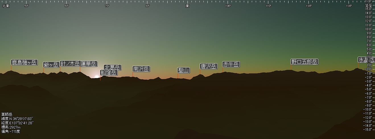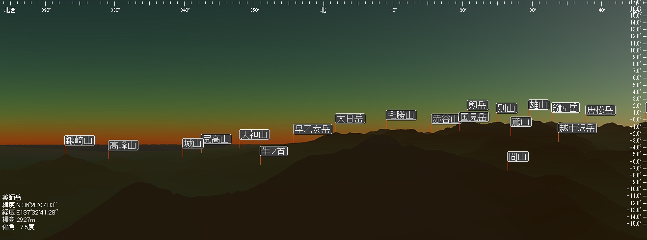 (更新時刻:2016/07/23 15:02) (更新時刻:2016/07/23 16:31) 8月7日、日の出時北方向 (更新時刻:2016/07/23 16:32) 8月7日、日の出時東方向 (更新時刻:2016/07/23 16:33) 8月7日、日の出時南方向 (更新時刻:2016/07/23 16:34) 8月7日、日の出時西方向 (更新時刻:2016/07/23 16:35) 8月7日、5時半北方向 (更新時刻:2016/07/23 16:35) 8月7日、5時半東方向 (更新時刻:2016/07/23 16:36) 8月7日、5時半南方向 (更新時刻:2016/07/23 16:36) 8月7日、5時半西方向 (更新時刻:2016/07/23 16:37) 薬師岳の花 (更新時刻:2016/07/24 10:46) |