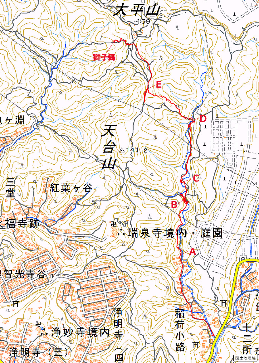 十二所神社バス停9:36---吉沢川源流入口(mapA)9:48---紅葉ケ淵(二俣、mapB)10:05〜24---渡渉淵(mapC)10:25〜35---丸太橋(mapD)10:58--- 天園ハイキングコース尾根道(mapE)11:30〜37---天園休憩所手前分岐11:43---獅子舞11:50〜12:30---鎌倉宮13:21---鎌倉駅13:58