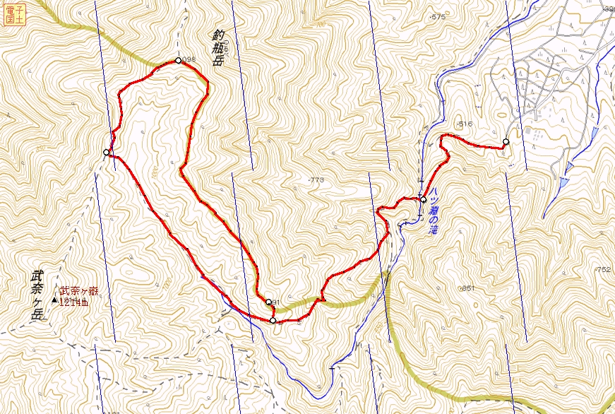 釣瓶岳までは一般登山ルート。 釣瓶岳から下るナガオ尾根、登山道合流点まではバリルートなので、 地図で尾根の方向、小ピーク、コルなどを前もって確認しておく。 |